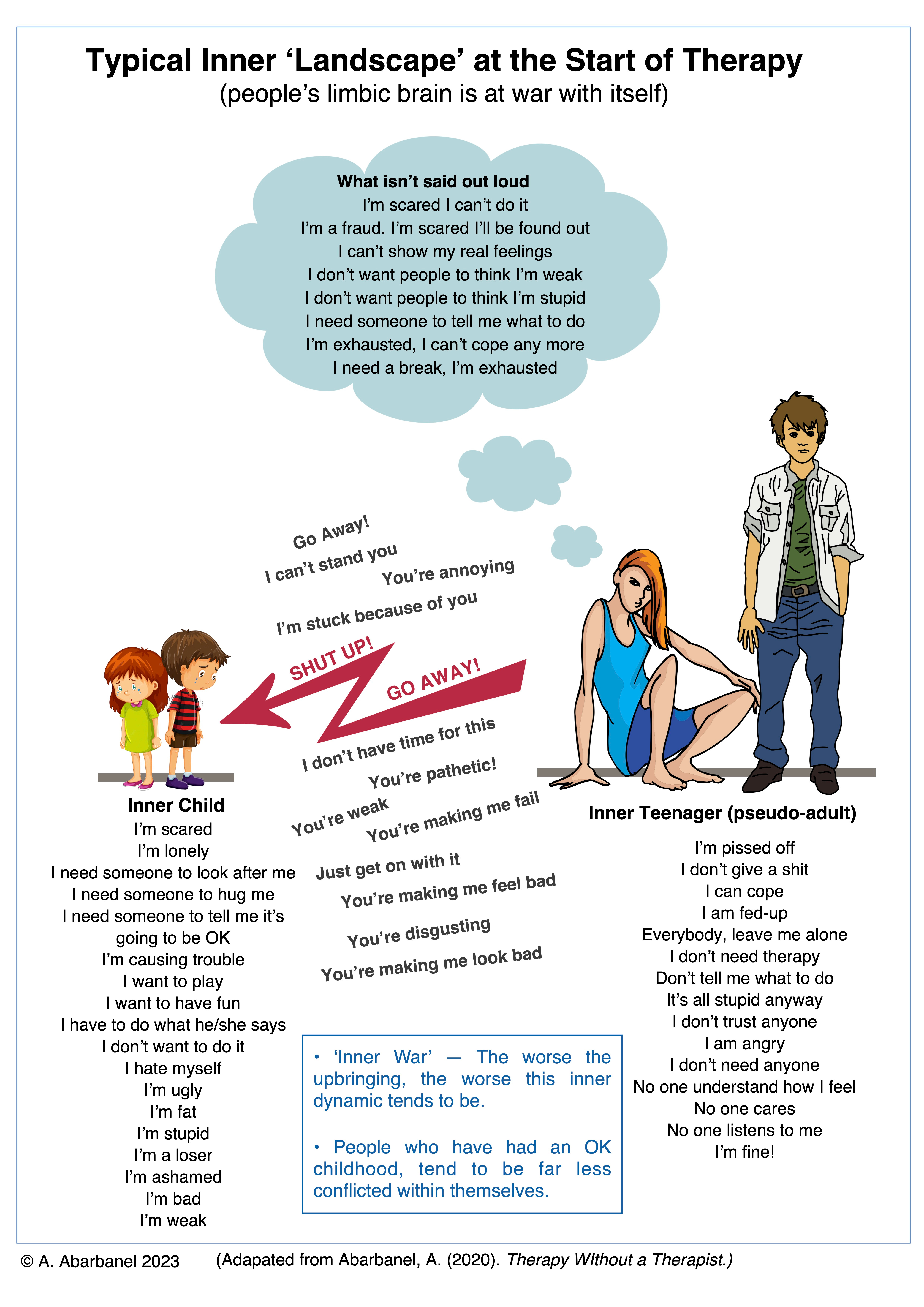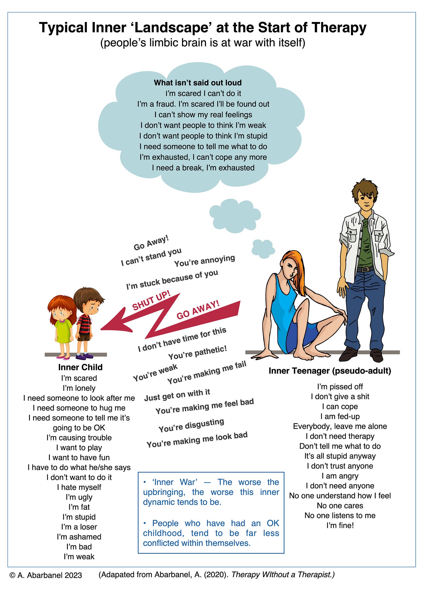 When most people come to therapy, they are in a state of war with themselves. Their limbic brain is fighting itself. This is always the result of not feeling validated in childhood and adolescence, and/or having been mistreated by the adult world around us.